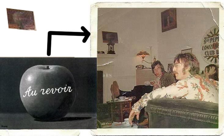 ‘In my garden at Cavendish Avenue, which was a 100-year-old house I’d bought, Robert [Fraser] was a frequent visitor. One day he got hold of a Magritte he thought I’d love. Being Robert, he would just get it and bring it. I was out in the garden with some friends. I think I was filming Mary Hopkin with a film crew, just getting her to sing live in the garden, with bees and flies buzzing around, high summer. We were in the long grass, very beautiful, very country-like. We were out in the garden and Robert didn’t want to interrupt, so when we went back in the big door from the garden to the living room, there on the table he’d just propped up this little Magritte. It was of a green apple. That became the basis of the Apple logo. Across the painting Magritte had written in that beautiful handwriting of his ‘Au Revoir’. And Robert had split. I thought that was the coolest thing anyone’s ever done with me. When I saw it, I just thought: ‘Robert’. Nobody else could have done that. Of course we’d settle the bill later. He wouldn’t hit me with a bill.‘ [ITP 20: Le Jeu de Morre by Rene Magritte, 1966; the Apple Corp. Logo, 1967]